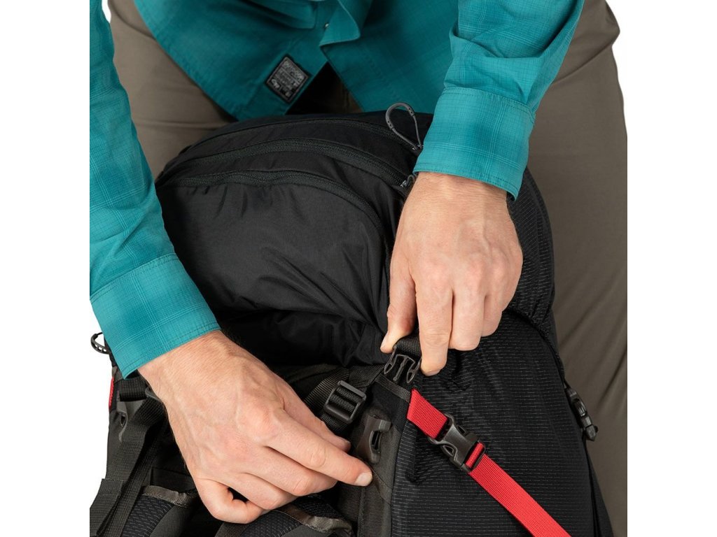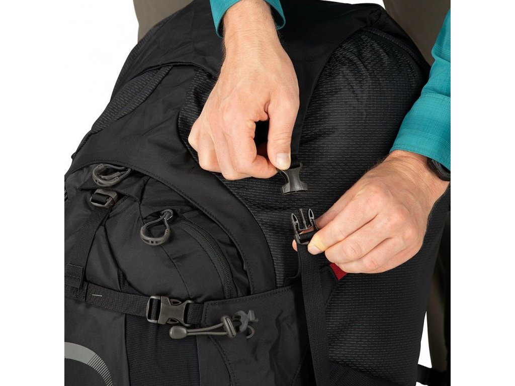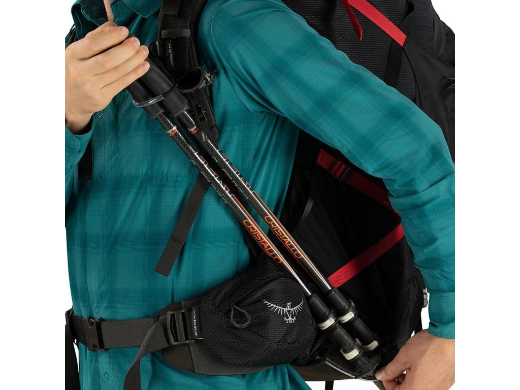 u postranních kapes na každé straně - Systém Stow-on-the-GoTM připevnění teleskopických holí