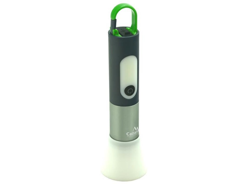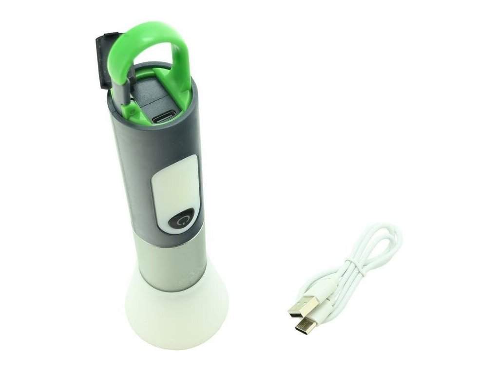 - zakončení svítilny je opatřené nabíjecí zásuvkou, která je chráněnou krytkou a pro snadné zavěšení je zakončení doplněné karabinkou
