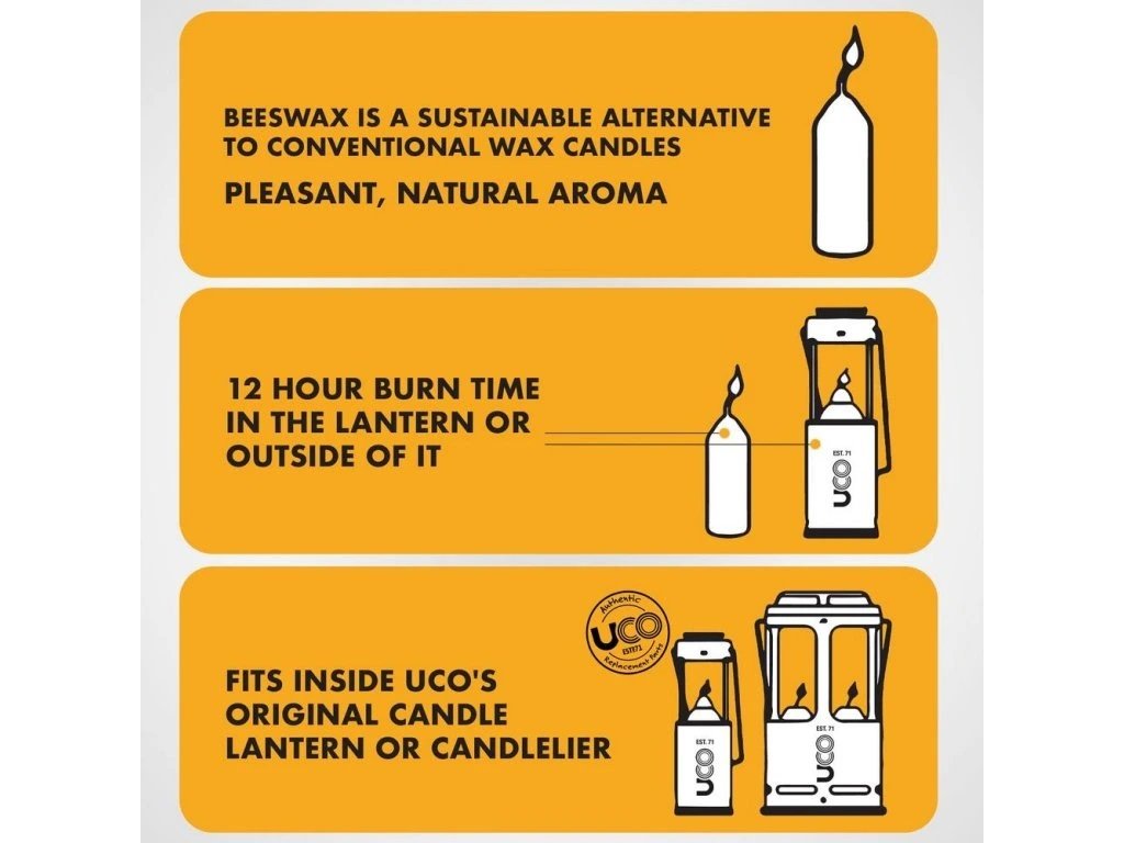 - Složení 100% přírodního včelího vosku (bez parafínu) je optimalizováno pro použití ve svíčkových lucernách UCO.